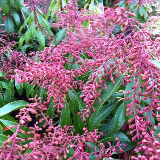 Pieris japonica 'Valley Valentine' is een mooie compact groeiende heester en wordt ongeveer 1,5 meter hoog. In de winter blijft die groen en is het een mooie verschijning. De wijnrode bloemen verschijnen circa vanaf maart tot en met april. Altijd aanplanten met heidegrond.