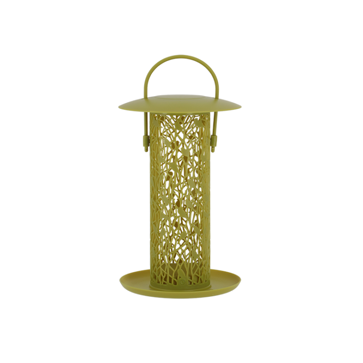 Deze notensilo met tray in trendy groen heeft een open structuur zodat de vogels gemakkelijk van het voer kunnen genieten. Door het deksel omhoog te schuiven is de silo eenvoudig te vullen en door de grote haak gemakkelijk op te hangen.